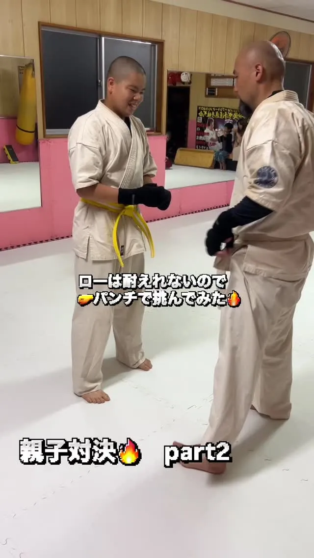 親子対決 part2 親子対決part2パンチだけで挑んだ結果、、、まだおやじには勝てませんでした🤣息子少しずつ強くなってるのですが、オヤジも練習頑張ってるから、2人とも成長してる、、、😳笑いい親子関係ですね🤩👍#空手#空…
